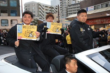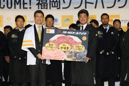 また、パレードに先立って行われた歓迎セレモニーにはソフトバンクCMでお馴染みの「白戸家のお父さん」も応援に駆け付け、さらに宮崎市の戸敷正市長よりアイビースタジアムに掲げられる昨年の日本一記念プレートと「完熟きんかん(たまたまエクセレント)」が贈呈されました。宮崎県の河野俊嗣知事からは、宮崎牛、みやざきブランドポーク、みやざき地頭鶏が激励品としてチームに贈られました。