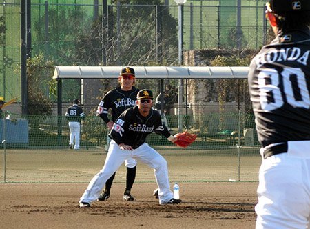 この日は全体練習後の特守に参加。松田宣浩選手や西田哲朗選手と一緒に、本多雄一1軍内野守備走塁コーチのノックの嵐に応戦しました。