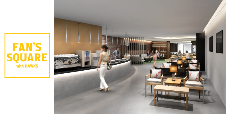 クラブホークス会員・タカポイント会員専用のラウンジ「FAN’S SQUARE(ファンズスクエア)」。タカポイントのステージによりご利用いただけます。試合前のくつろぎの場所として、さらには試合観戦も可能なコミュニケーションスペースとしてご利用ください。ラウンジ内では、無料でソフトドリンクや軽食などを提供します。(アルコールや一部フードは有料メニューも提供予定)