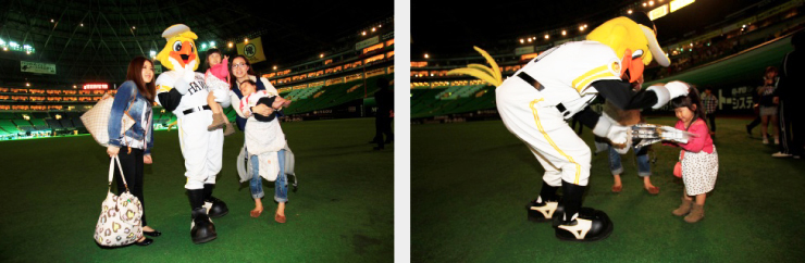 試合終了後、グラウンドでホークファミリーと写真撮影会を実施いたします。さらに記念グッズのプレゼントもございます!