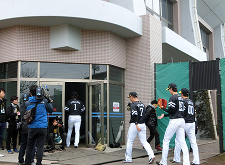 また、A組は午前中に非公開でサインプレーの確認を行いました。午後は雨天の為に「はんぴドーム」で練習。限られたスペースでしたが、その分選手たちは考え、創意工夫を凝らした練習メニューを行いました。ブルペンではシャドーピッチングを行う選手がいるのはもちろん、武田翔太投手は手づくり平均台などを使用したフォームづくりに励み、大竹耕太郎投手はゴムチューブで後ろから引っ張られた中で投げ、嘉弥真新也投手は短いバットでテニスボールを打ち返して体のキレを出していました。