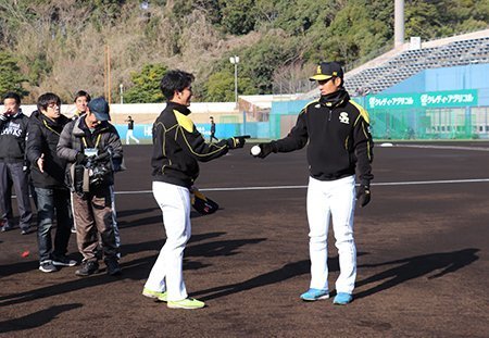サインを書き、栗原選手がボールを投げ終わったところに、上林選手がやってきました。