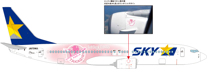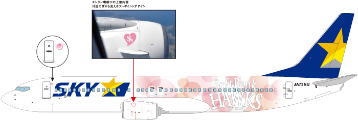 「タカガールジェット」は、ホークスを応援する女性の総称「タカガール」のロゴなどをデザインした機体です。今年の機体デザインは、2019年度タカガールユニフォームの「Flare(フレア)」デザインのコンセプトである、キラキラとした女性の輝きをスポットライトが当たっているような光のフレアで表現しました。この機体は全国の就航地に運航いたします。機内もホークスやタカガールにちなみ、ご搭乗及び降機の際に「いざゆけ若鷹軍団」の放送や客室乗務員が「タカガールユニフォーム」を着用するなど、ホークスとタカガール一色の演出でお客様をお迎えいたします。