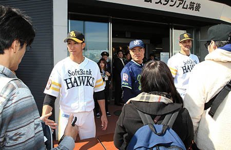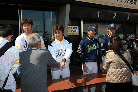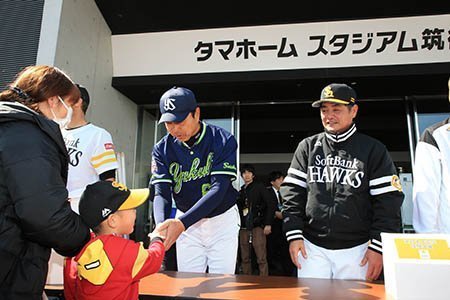 ホークスからは工藤公康監督、柳田悠岐選手会長をはじめ、千賀滉大投手、サファテ投手、内川聖一選手、福田秀平選手、今宮健太選手が参加しました。また、この日の対戦チームのスワローズからも小川淳司監督、高梨裕稔投手、中村悠平選手、西浦直亨選手が駆けつけました。