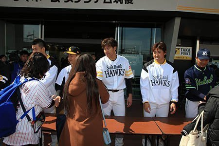 3月9日(土)、2011年に発生した東日本大震災からまもなく8年を迎えるにあたり、オープン戦の行われたタマホームスタジアム筑後で被災地支援に向けた募金の呼びかけ活動を行いました。
