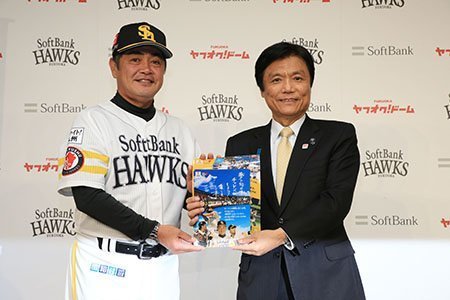 3月13日(水)、ヤフオクドーム内のプレスカンファレンスルームにて、チームを代表して工藤公康監督と柳田悠岐選手会長が出席。福岡県の小川洋知事と福岡県内の児童代表の少年少女たちへの贈呈式が執り行われました。