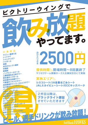 ヤフオクドーム開催ホークス主催公式戦全試合で、ビクトリーウイング4エリア(シスコシート・JA全農なごみシート・JALスカイビューシート・ECCキッズパーク)において、おひとりさま2,500円(税込)の飲み放題を実施しております。