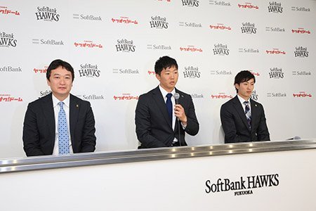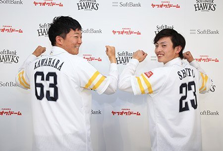 3月26日(火)、育成枠だった川原弘之投手と周東佑京選手が支配下契約を結び、ヤフオクドームにて会見が行われました。ホークスで育成枠から支配下登録されたのは27、28人目(28、29例目)となりました。新しい背番号は川原投手が「63」、周東選手が「23」となります。