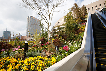 九州には365日美しい季節の表情があります。豊かな緑と彩りある花で、四季があり、鳥や蝶が飛ぶ自然を創出するという考えのもと、花が咲く木、実がなる木、紅葉する木、香りがする木など多種類の樹木や草花を配置し、皆さんが季節や癒しを感じられる花壇を造りました。