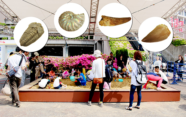 ドームの砂場に埋められたスピノサウルスの歯、モササウルスの歯、アンモナイトを見つけよう。見つけた方は化石を1つプレゼント。