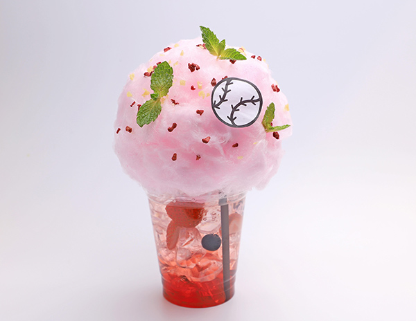 さくらソーダの上には桜をイメージしたピンクの綿飴が乗り、中にはイチゴとブルーベリーが浮かんだ爽やかなドリンクです。
