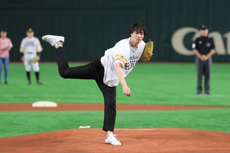 そして始球式には俳優で劇団EXILEの鈴木伸之さんが臨みました。「小1から中2まで野球をやっていた。肘を壊してやめてしまったけど、プロ野球のマウンドに立てる夢をまた違った形で叶えることが出来て嬉しかったし、気持ちよかったです」と満面の笑顔。元野球少年の実力はホンモノで122キロの快速球を甲斐拓也捕手に投げ込みました。