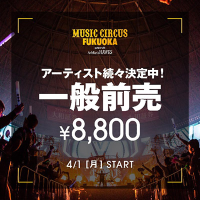 福岡ソフトバンクホークス株式会社(所在地:福岡市中央区)と、株式会社トライハードジャパン(所在地:大阪市中央区)は、7月13日(土)開催の「MUSIC CIRCUS FUKUOKA partner with SoftBank HAWKS」の第5弾出演アーティストを発表いたします。