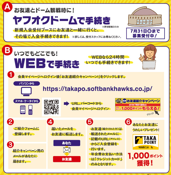 第3弾では、期間中にクラブホークスにお友達やご家族をご紹介いただいた方と、紹介でご入会いただいた方それぞれに、タカポイント1,000ポイントをプレゼントいたします。