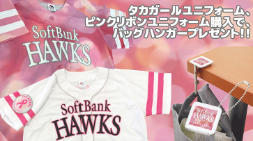 HAWKS STORE ドーム店でタカガールユニフォームまたはピンクリボンレプリカユニフォームを1枚購入につき「タカガールオリジナルバッグハンガー(非売品)」1個プレゼントいたします。先着順・数量限定につき、景品がなくなり次第キャンペーンは終了となります。