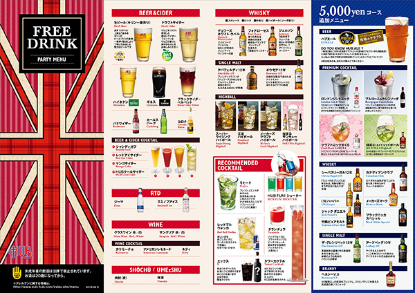 様々な種類のビール、100種以上の“HUBの人気カクテル”やソフトドリンクが飲み放題。