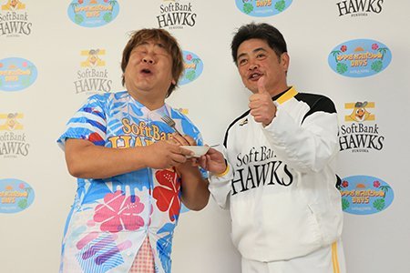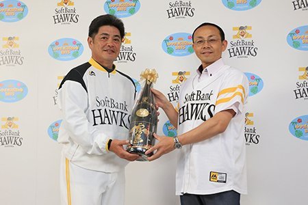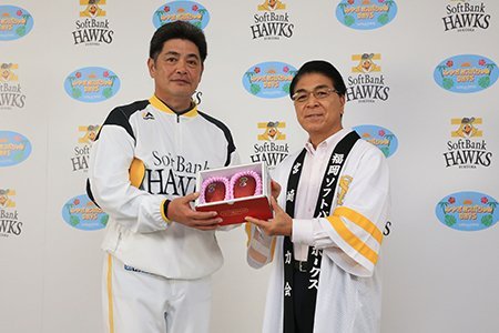 そして2日(日)には、工藤公康監督へ激励の品も授与されました。宮崎市・戸敷正市長からは「宮崎産 完熟マンゴー 太陽のたまご」、都城市・池田宜永市長からは「霧島酒造『黒霧島 益々繁盛』」がそれぞれ贈られました。