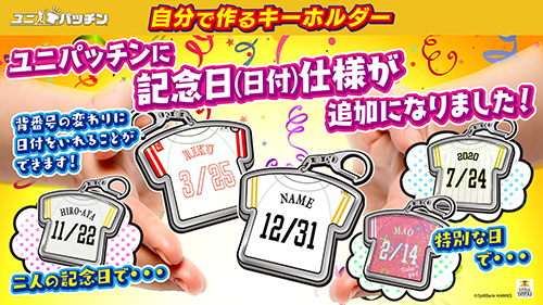 人気シリーズ、観戦記念やお誕生日など記念日の日付をいれられるオリジナルユニパッチンも!お友達や家族、大切な人とおそろいのキーホルダーをぜひ作ってみませんか。