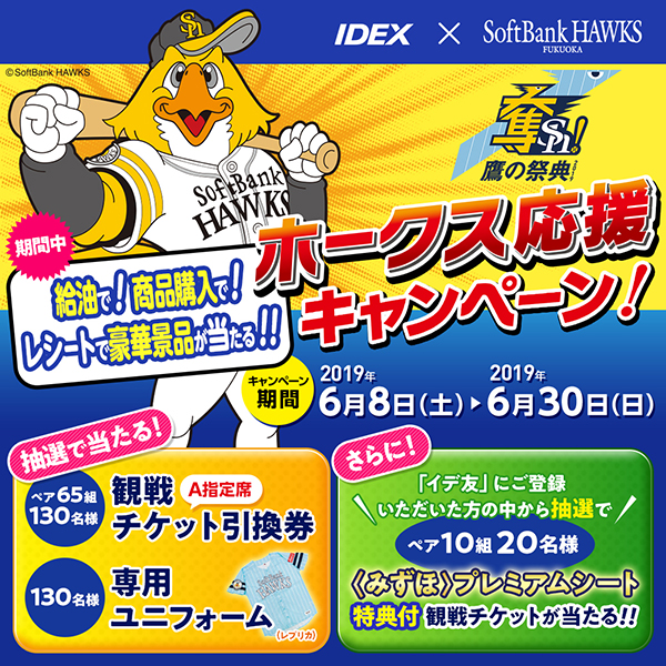 6月8日(土)から 6月30日(日)まで、「イデックス」サービスステーションで商品1,000円以上のご購入、またはガソリン・軽油10L以上給油のレシートでご応募いただくと、抽選でホークスの豪華景品が当たります!