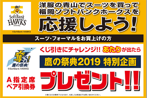 洋服の青山対象店舗にて対象商品を買って、鷹の祭典2019のチケットがあたるくじ引きにチャレンジしよう!