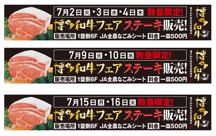 7月2日(火)・3日(水)・4日(木)・9日(火)・10日(水)・15日(月)・16日(火)7日間限定で、ヤフオクドームJA全農なごみシートにおいて、「博多和牛フェア ステーキ販売」を開催します!