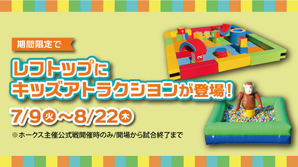 福岡 ヤフオク!ドームのレフト側外野席後方に新たに誕生した「LEFTOP SPACE」(レフトップスペース)に、7月9日(火)~8月22日(木)の期間限定で、無料で楽しめるキッズアトラクションが登場!
