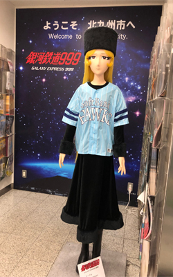 また、昨年に引き続き、北九州市行政窓口等のスタッフによる鷹の祭典ユニフォームの着用に加え、北九州市ゆかりの漫画家である松本零士氏のアニメ作品「銀河鉄道999」に登場するメーテルが、鷹の祭典ユニフォームを着用し、7月8日から小倉駅観光案内所に登場します。