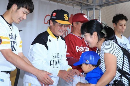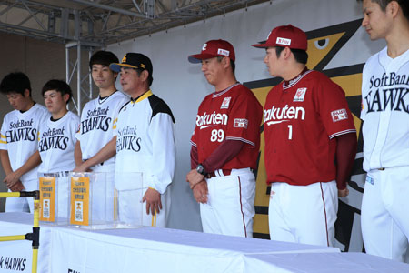 8ゲート外の特設ステージに、ホークスからは工藤公康監督、大竹耕太郎投手、武田翔太投手、甲斐野央投手、牧原大成選手、上林誠知選手、釜元豪選手が登場。この日の対戦相手のイーグルスからも平石監督、松井投手、岸投手、小野投手が参加しました。