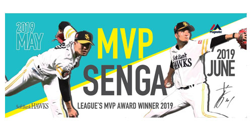 千賀投手の5月度に続き2カ月連続MVP賞受賞を、クールな投球シーンと爽やかな配色でデザインしました。これをかかげて後半戦も千賀投手を熱く応援しよう!