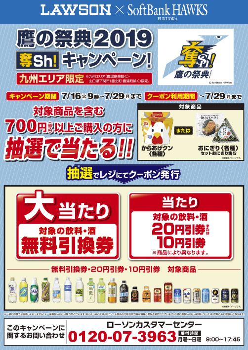 ローソン(九州エリア限定※)では、福岡ソフトバンクホークス鷹の祭典2019のコラボキャンペーンとして、店頭でクーポンが当たる、「鷹の祭典2019 “奪Sh!”キャンペーン!」を実施中です!