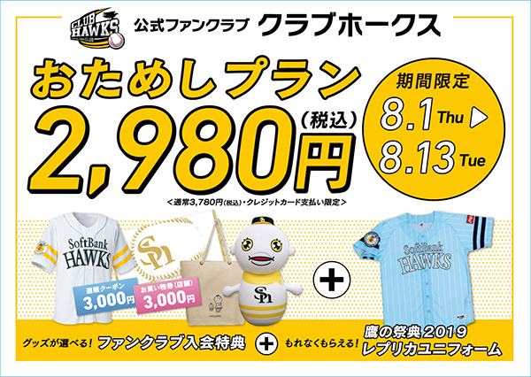 シーズン後半戦に向けてホークス公式ファンクラブ クラブホークスの一員として、お得にホークスを応援したいファンのために、8月1日(木)より、「おためしプラン」が新たに登場します。