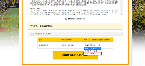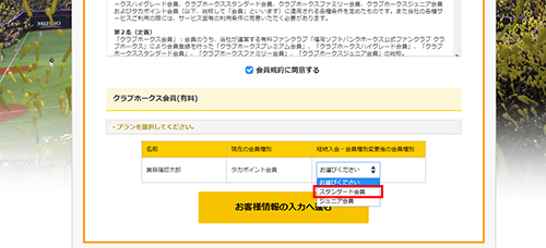 ②送信したメールアドレス宛に、申し込みページのURLをお送りいたします。会員規約に同意し、「クラブホークス会員(有料)」からスタンダード会員としてお手続きを進めてください。