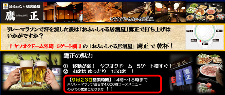 前回も好評いただいた「おふぃしゃる居酒屋 鷹正」、ヤフオクドーム「なごみシート」に加え、今年は英国風パブ「HUB福岡 ヤフオク!ドーム店」も会場に追加されました!