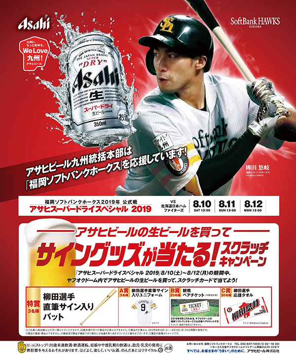 期間中、アサヒビールの生ビールを購入していただいたお客様に柳田選手のサイン入りグッズや観戦チケットなどが当たるキャンペーンを実施します。