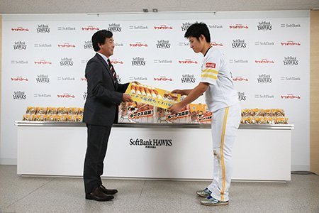「フジミツ株式会社」様より、同社とホークスのタイアップ商品「ホークス応援!仙崎ちくわ」1年分がチームに贈呈されました。
