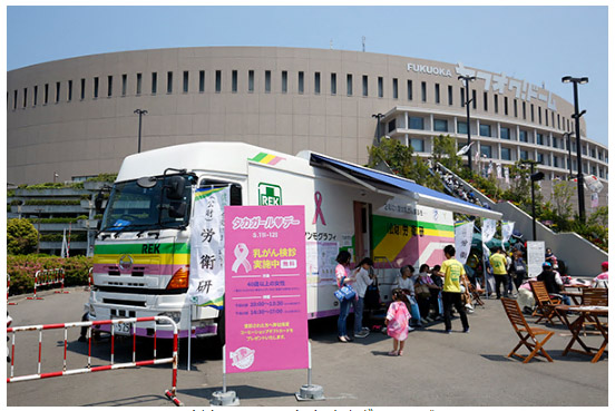 乳がん検診車が登場し、マンモグラフィによる乳がん検診を実施します。検診にかかる費用の一部は、ホークスからハッピーマンマへの寄付金が活用されます。