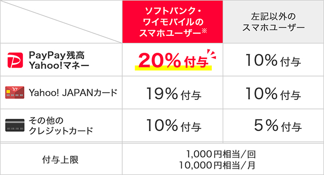 ※1 PayPay残高の付与上限は、お一人様につき「1回の支払いにおける付与上限」は1,000円相当。「ひと月あたりの付与合計上限」は10,000円相当です。ソフトバンク・ワイモバイルスマホユーザーへのPayPayボーナスの付与率は最大20%、左記以外のスマホユーザーは最大10%です。なおソフトバンク・ワイモバイルユーザーへの最大20%のPayPayボーナス付与にはソフトバンク・ワイモバイル携帯電話番号との連携、またはスマートログイン設定/Y!mobileサービスの初期登録が必要です。
