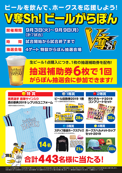 9月3日(火)~9月9日(月)の東北楽天ゴールデンイーグルス戦、千葉ロッテマリーンズ戦において「V奪Sh!ビールがらぽん抽選会」を開催いたします。期間中、ヤフオクドーム場内でビール1杯お買上げにつき、補助券を1枚お渡しいたします。補助券6枚で抽選会に1回ご参加頂けます。特賞は、なんと若鷹選手の直筆サイン入り「鷹の祭典2019レプリカユニフォーム」をプレゼント!!まだまだ暑さの残る9月は冷たいビールを飲んでホークスを応援しましょう!!