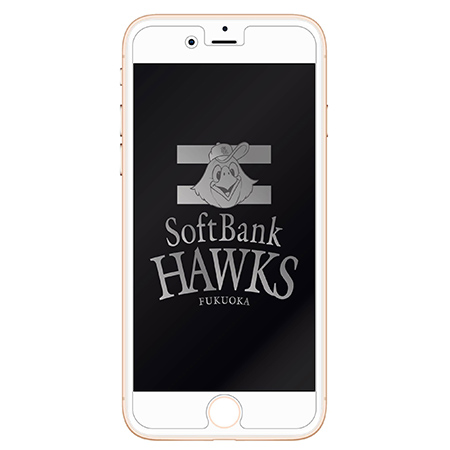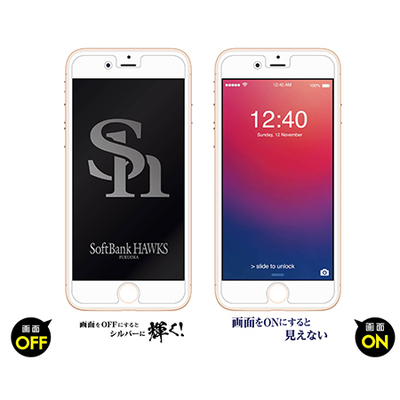 iPhoneのホームボタンがOFFの時ホークスロゴが表示され、ホームボタンをONにするとロゴが見えなくなる特殊な印刷が施されたiPhone用画面保護フィルムです。