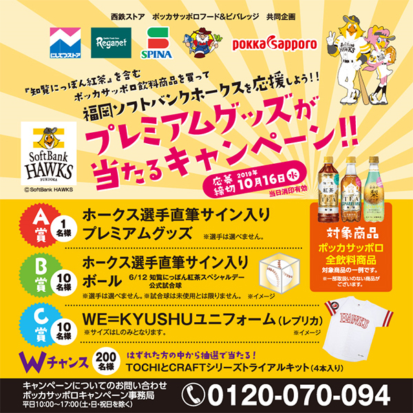 西鉄ストアにて「知覧にっぽん紅茶」などのポッカサッポロ飲料商品を含む1,000円(税抜)以上お買い上げでホークスグッズなどが当たるキャンペーンを開催します!