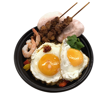 本場に近い味付けをしたナシゴレンに、インドネシアの串焼き『サテ』と、ヒット0・得点0をイメージして半熟目玉焼きを2つ添えました!ご飯と半熟の目玉焼きをしっかり混ぜて本場の味をお楽しみください。