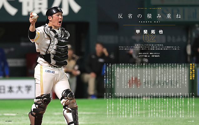 また、レギュラー捕手としてチームをけん引する甲斐拓也選手にもインタビュー。今シーズンは打撃も好調で、すでにキャリアハイの成績ですが、リード面を反省。「もっとやれていれば勝てた試合もあった」とキャッチャーとして責任を感じている甲斐選手。これからの課題と残りのシーズン、さらにはポストシーズンへの意気込みを語ってくれています。
