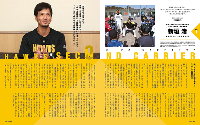 10月号から新企画がスタート。現役を引退した選手がどんなステージでどんな活躍をしているのか気になりますよね!?そんな疑問にお応えすべく『月刊ホークス』では、元選手の第二の人生に迫ります。第1回目にはホークスで背番号18を背負ってきた新垣渚さんが登場。現在は子どもたちに野球を指導するスポーツ振興に携わっています。そのお仕事の内容について聞きました。
