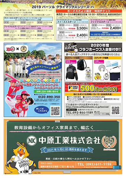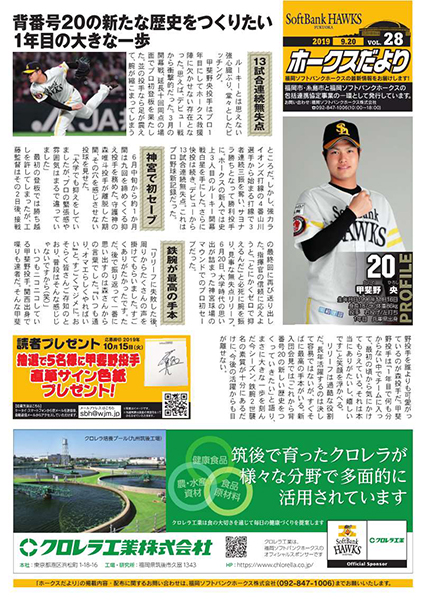 9月号は、今シーズンホークスのセットアッパーとして活躍している甲斐野投手が登場。甲斐野投手のサイン色紙が当たるプレゼント企画やホークスだより限定の2019 パーソル CS パ特別チケット、2020年度クラブホークスの入会受付情報もあります!