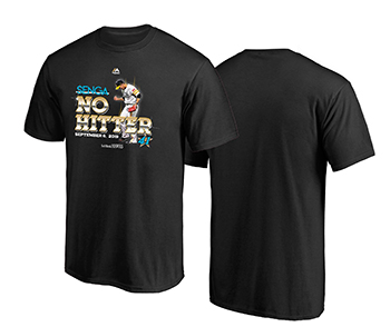 ブラックボディに千賀投手が記録達成した直後にした気迫あふれるガッツポーズと、迫力あるタイポグラフィで「NO HITTER」をデザインした記念Tシャツです。