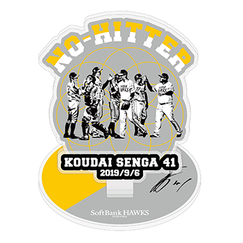 千賀投手のノーヒットノーラン達成時デザインフォトを、アルミ製フォトパネルに額装。選手本人の直筆サインと2019年実ユニフォーム断片、記録達成した日の試合球の断片も封入された貴重なメモリアル・フォトパネルを受注販売します。シリアルナンバー入りのプレミアムアイテムです。