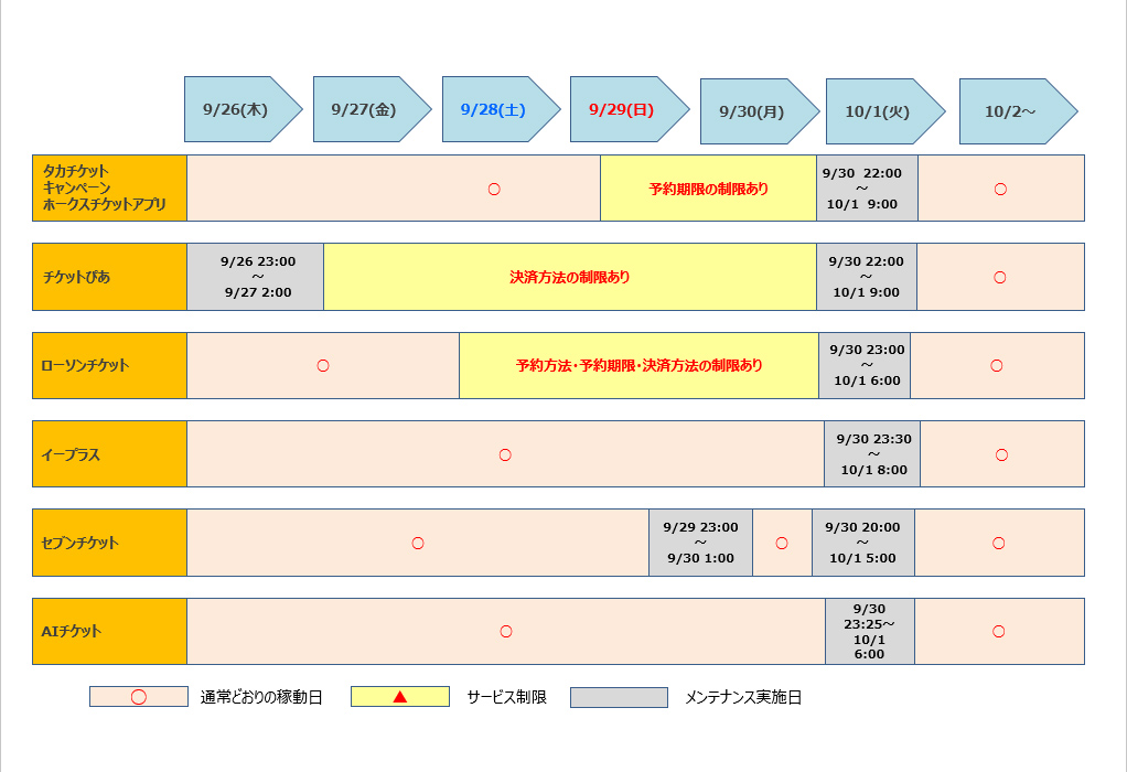 システムメンテナンスに伴い、以下の期間において、一時制限または停止させていただくため、サイト閲覧やチケットの購入、発券等ができない状態となります。