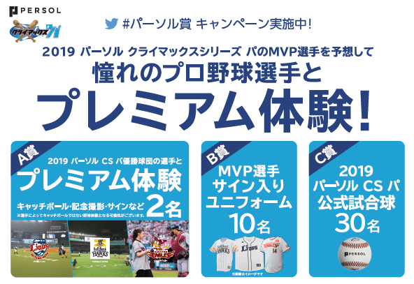 2018年に続き2019年もパシフィック・リーグオフィシャルスポンサーとなった総合人材サービスのパーソルホールディングス株式会社が「2019 パーソル クライマックスシリーズ パ」のMVP選手(パーソル賞受賞選手)を予想して当てた方に、抽選で優勝チームの選手とのプレミアムな体験をプレゼントするTwitterキャンペーンを開始いたします。