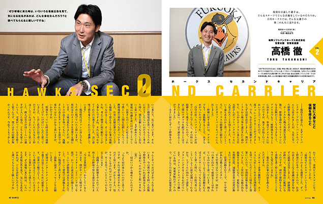 10月号からスタートした「セカンドキャリア」。2回目となる今回は、元投手の高橋徹さんに登場していただきました。現役時代は度重なる肩のケガで苦しい思いをたくさんしてきた高橋徹さんですが、現在はホークスの社員として広告の提案などを企業へ行うバリバリの営業マンとして活躍されています。そのお仕事の内容を語っていただきました。