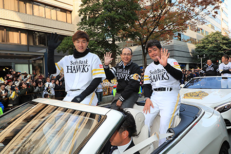 ホークス主力選手がオープンカーやオープントップバスなどに分乗し、コースをパレード